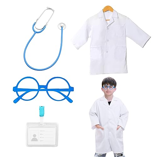 TSHAOUN Costume da Dottore Scienziato Bambini, Set da 4 Pezzi Camice da Medico Laboratorio con Tesserino da Lavoro Stetoscopio Occhiali, Scienziato Gioco di Ruolo Medico per Ragazzi e Ragazze