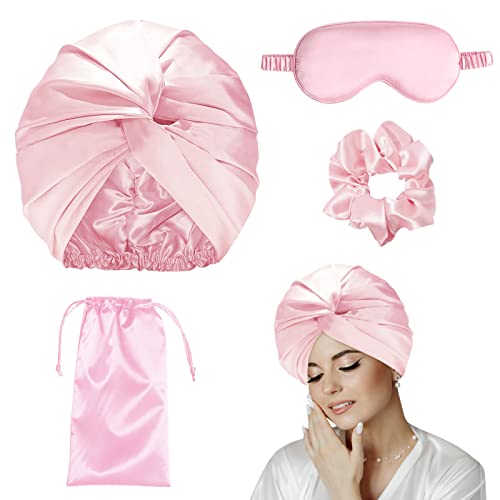 TSHAOUN Cuffia Seta Capelli Ricci,4 Pezzi Set Berretto da Notte Donna Cuffia Capelli in Raso con Fascia di Seta, Maschera per Gli Occhi, Custodia, Cuffia da Notte per Lavaggio, Trucco, Viaggi (Rosa)