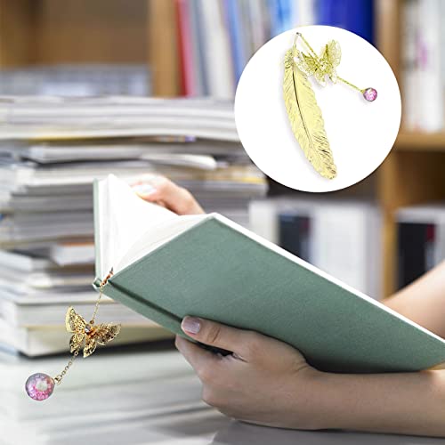 TSHAOUN 2 segnalibri classici in metallo con piume con farfalla 3D e ciondolo, fiori secchi, piccoli regali creativi adatti per regali, per insegnanti, amici o lettori femminili. (oro argento)