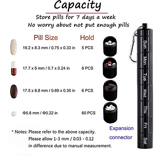 Organizer per pillole settimanale: questo portapillole nero ha 7 scomparti, ogni divisore misura 3 x 2,5 cm, ideale per riporre pillole di 7 giorni 2-4 volte al giorno in base alle dimensioni della pillola.