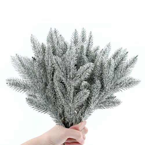 TSLBW 20 Pezzi Rami di Pino Artificiale, Rami di Aghi di Pino Innevati, Neve Smerigliata Finta Verde Pino Picks per fai da te Ghirlanda Composizione Floreale Albero di Natale Decorazione di Vacanza
