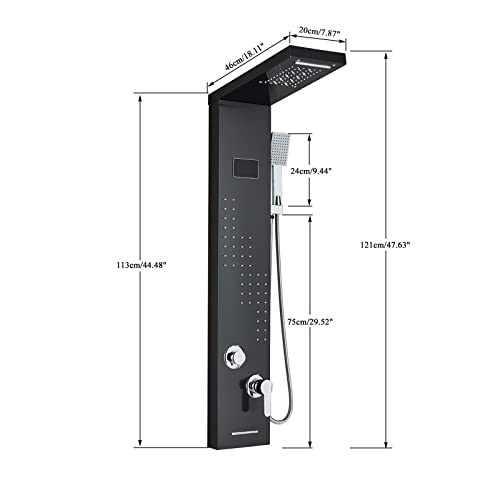 TTICCTIY Pannello doccia a LED nero, in acciaio inox, sistema doccia a 5 funzioni, con batteria per vasca da bagno, soffione a cascata, ugello massaggiante, doccetta a parete, pannello doccia