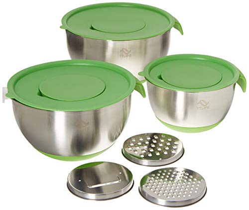 TTLIFE Set da 3 pezzi in ciotola di miscelazione dell'acciaio inossidabile con i coperchi che versano le boccole, le maniglie, la base di silicone non slittante e gli accessori di grattiglia 3
