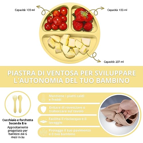 TudoBem Piatto con Ventosa per Bambini [5 Pezzi] Senza BPA | Piatto per scomparto[x3] Forchetta e cucchiaio per l'apprendimento del bambino [x1] | Silicone alimentare al 100%