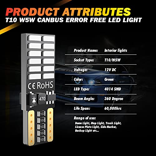 TUINCYN 194 168 T10 192 2825 W5W Lampadina a LED verde 800 lumen Interni auto Cupola Luce Cruscotto Luce Targa Luce laterale Luce di posizione Luce di backup 12V ~ 24V (confezione da 10)