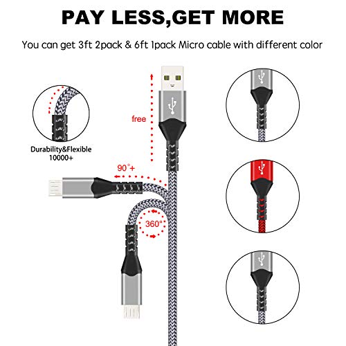 Tujun - Cavo micro USB, confezione da 3 pezzi, 0,9 m + 0,9 m + 1,8 m, cavo di ricarica rapida per Samsung Galaxy S7, S6, S5, J7, Note 5, Kindle, Nexus, Sony, Xbox, HTC, PS4 e altri argento e rosso.