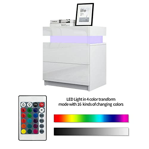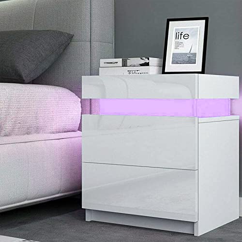 TUKAILAi - Comodino bianco con luce LED e 2 cassetti, finitura altamente lucida, per camera da letto e soggiorno