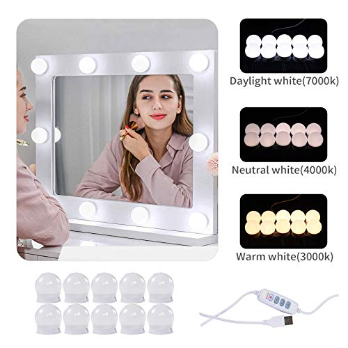 TUKAILAi Tavolo da toeletta con specchio, Toeletta con 10 Luci LED Dimmerabili, con Sgabello Imbottito, 1 Cassetto, Postazione Trucco, Idea Regalo, Tavolo per Cosmetici, Postazione Trucco Bianco
