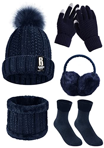 Tuopuda Cappello Sciarpa e Guanti Touch Screen Donna Invernali Berretto in Maglia Beanie Collo della Ciarpa 5 Pezzi Beanie Hat Scaldacollo Calzini Ispessiti Paraorecchie Earmuffs di peluche, Blu