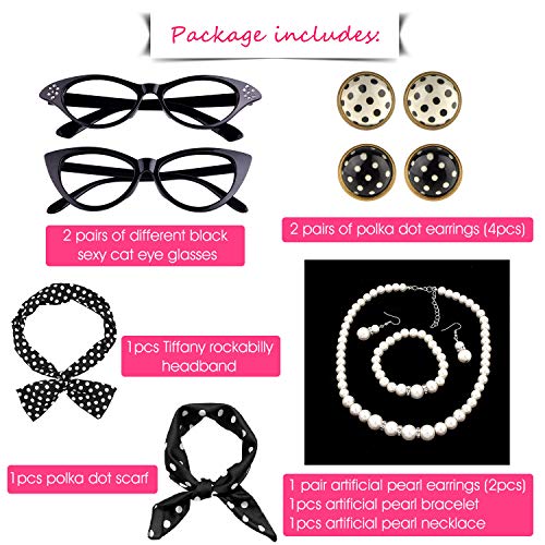 TUPARKA Set di accessori per costumi 12 pezzi anni '50 Include occhiali da vista a gatto Polka Dot Orecchini e sciarpa, fascia per capelli, bracciale e collana per la festa
