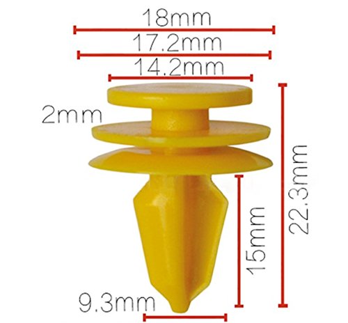 La dimensione delle clip è come la foto, è usata per fascia anteriore/posteriore, parafanghi, griglia, cappuccio, pulitore aria, modanature laterali a bilanciere, scudo sottoscocca, scudi per ruote, piastre per serratura, sistema di fissaggio a rondelle. Queste clip possono essere utilizzate ovunque se la dimensione è la stessa. Nota: la luce e i diversi schermi possono causare il colore dell'articolo nella foto un po' diverso da quello reale. L'errore di misurazione consentito è di +/- 1 mm.