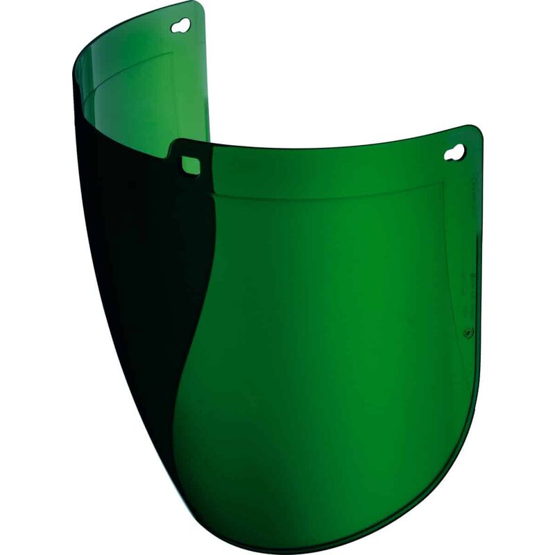 Visiere con ampio campo visivo e un'ottima protezione nella zona del mento e del collo. Tutte le visiere sono certificate per la protezione UV e proteggono dai liquidi e dagli spruzzi di metallo fuso nonché dagli urti di media intensità anche a temperature estreme (da -5 °C a 55 °C). Visiera in policarbonato con grado di protezione IR 5. Norma: EN 166 Per: Supporto per la testa e portacasco n. art. 097885 e n. art. 097886. Dati tecnici Tipo di prodotto Visiera Codice delle lenti 5 HON 1 BTA39 Materiale lenti Policarbonato Tinta delle lenti verde Protezione UV Standard Rivestimento lenti Livello di protezione IR 5