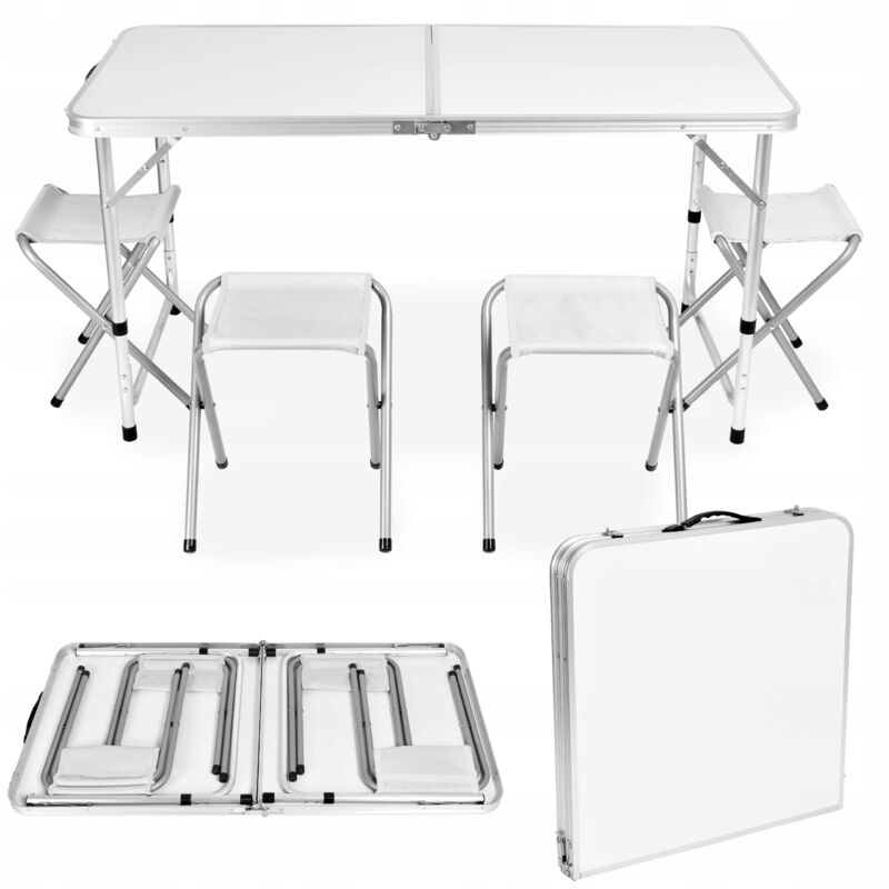 TRAMP set turistico tavolo da campeggio con 4 sedie bianco Dimensioni: 120 x 60 cm | Colore: bianco| Modello: pieghevole in valigia ⭐Fino a 3 livelli di regolazione in altezza! Il set da campeggio turistico TRAMP è composto da un tavolo e quattro sedie. Il set si apre comodamente e si ripiega in una valigia. Una comoda maniglia aiuta nel trasporto. Il tavolo è regolabile in altezza, il piano può essere regolato a tre altezze. Il telaio TRAMP è realizzato in alluminio di alta qualità, il che lo rende molto leggero. Il piano del tavolo è realizzato in resistente pannello MDF. Questa combinazione di materiali garantisce un peso ridotto, facilitando il trasporto del set. Assemblare il tavolo e le sedie è molto semplice. Il tavolo è dotato di una maniglia che ne consente un comodo trasporto. Vantaggi: ✅Design compatto ✅Portatile ✅Leggero ✅Altezza regolabile: il tavolo offre una regolazione dell'altezza in tre fasi, che consente di adattarlo a varie esigenze e impostazioni. ✅Facile da