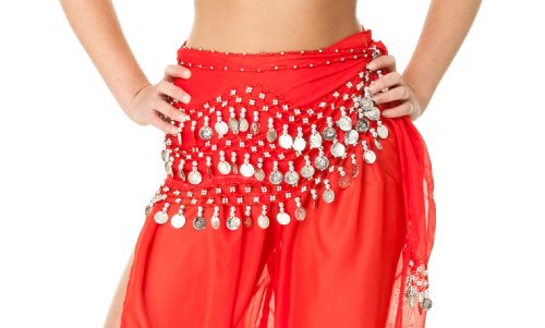 The Turkish Emporium Chiffon 3 File di Danza del Ventre Hip Sciarpa Cintura Moneta con 128 Monete, Rosso/Argento, Taglia Unica