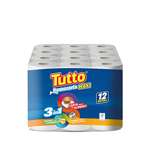 Tutto Pannocarta Maxi 3 in 1,12 Maxi Rotoli di Carta Multiuso, 1 Velo, 100* strappi, Extra Assorbente, Lavabile e Riutilizzabile più di 20 Volte, 100% Made in Italy