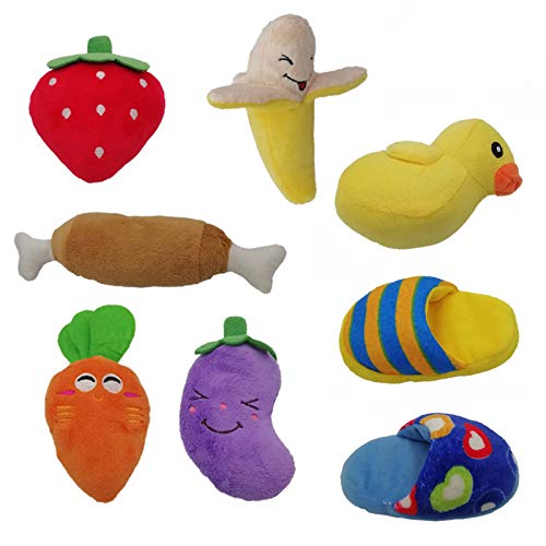 Contiene 8 tipi di giocattoli per cani: il set include i giocattoli per cani più popolari, tra cui giocattoli cigolanti, carote, fragole, giocattoli da masticare, banane, pantofole, ecc.