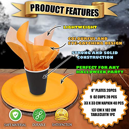 Caratteristiche - Il nostro set da tavola ha 10 tazze e 10 piatti arancioni e neri, 20 tovaglioli neri e arancioni a doppio strato e 1 tovaglia arancione. Perfetto per le tue feste a tema Halloween: ha tutto il necessario per decorare il tuo tavolo con colori luminosi e festosi, adatti al tuo evento.