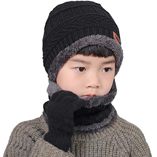 Twilker 3pcs Beanie Bambino Cappello Inverno Bambino Sciarpa Inverno e Guanti Set (Nero)