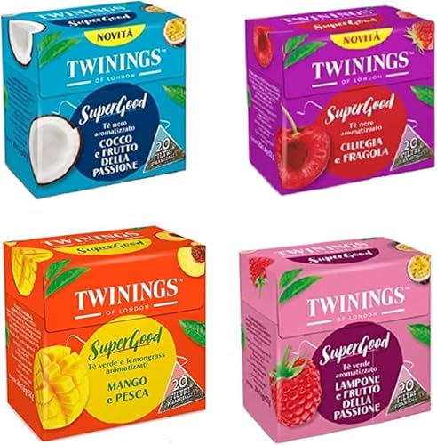 Twinings, Supergood, Miscela di Tè Nero e Ibisco Aromatizzati al Mirtillo e Lampone, Note Vivaci e Sofisticate, 4 Confezioni da 20 Filtri