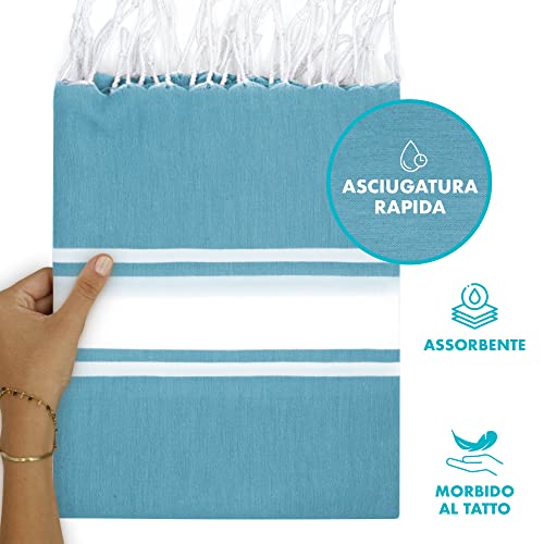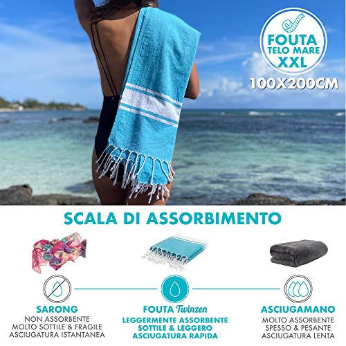 Twinzen - Fouta 100x200cm XXL Turchese - 100% Cotone OEKO-TEX - Telo Mare Grande - Asciugamani Hammam Bagno Turco - Sauna - Asciugamano Bagno - Telo Mare Cotone - Telo Mare Fouta