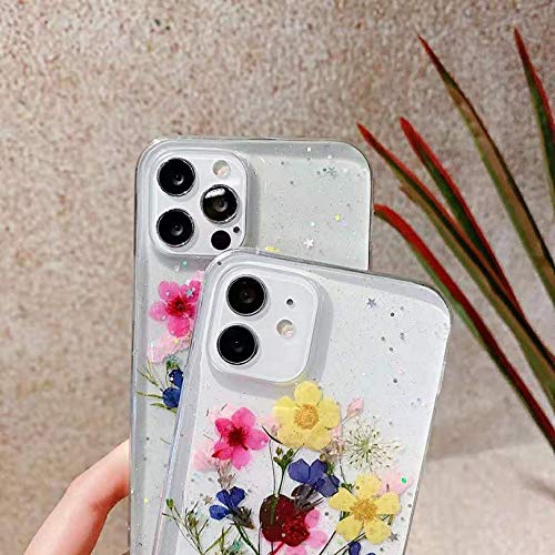 Tybiky, custodia protettiva per iPhone 12 Pro, decorata artigianalmente con veri fiori secchi, stile floreale, cover compatibile con iPhone 12 Pro/12, 1 fiore di colore rosa e giallo blu