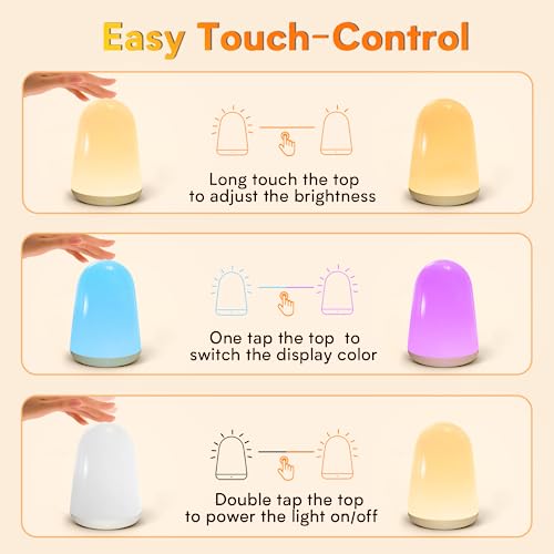 【Facile controllo touch】:Lampada notturna modalità luce calda regolabile in continuo tramite tocco. Modalità RGB Toccare la parte superiore per selezionare automaticamente il colore ciclico o selezionare il colore desiderato. Premendo brevemente il pulsante di accensione si passa dalla modalità di illuminazione a luce calda a quella a colori RGB. Tieni premuta la parte superiore per 1,5 secondi per attivare la modalità luce notturna, usalo per allattare e cambia i pannolini.