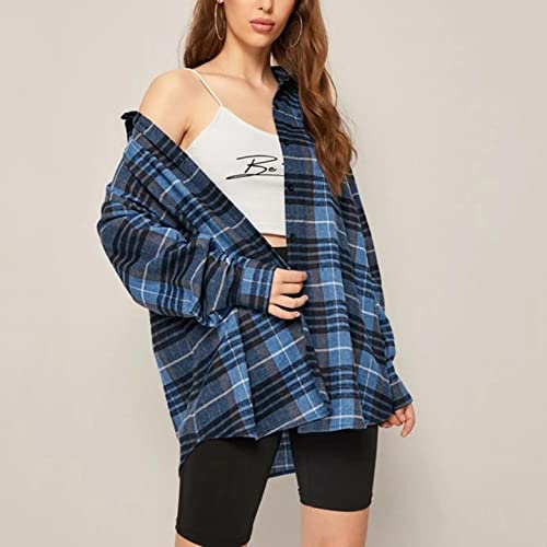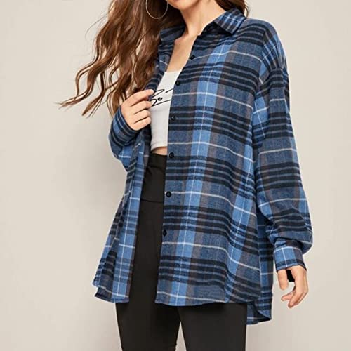 TYTUOO Moda Donna Casual Plaid Top Autunno Camicia Manica Lunga T-shirt Button Top Giacca Cappotto Moda Streetwear Outwear, a-blu, M