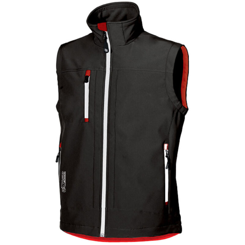 Gilet da lavoro in tessuto Soft Shell stretch traspirante antivento e idrorepellente. Tasca portacellulare su petto con chiusura zip;