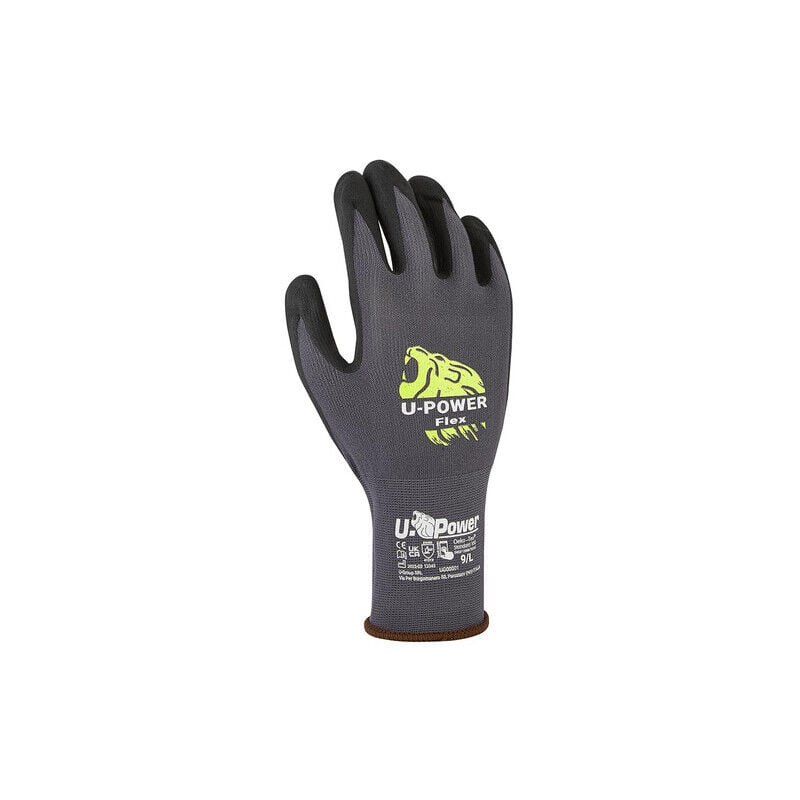 U-POWER GUANTI FLEX GRIGIO TAGLIA 10 Mod. Flexpalmo traspirante in Nano schiuma di nitrile traspirante ed elasticizzato, Eccellente resistenza all'abrasione. Polsino confortevole in nylon elasticizzato. Taglia 10 Colore grigio Categoria dell'articolo: GUANTI DA LAVORO