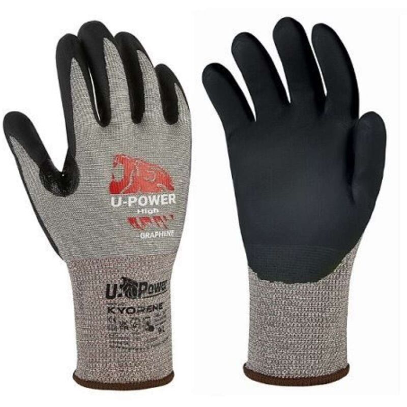 sono guanti di alta qualità realizzati con fodera in grafene sottile, resistente e flessibile . La struttura impedisce lo sviluppo di batteri nocivi alla salute delle mani, riequilibrando l'acidità del sudore, evitando la nascita di cattivi odori . Inoltre il grafene favorisce l'omogenea distribuzione del calore in ambienti caldi o freddi, mantenendo una temperatura sempre costante, proteggendo le mani anche dai raggi UV-A e UV-B. I Guanti antitaglio UPower High hanno il palmo della mano in schiuma di nitrile, traspirante ed elasticizzato;