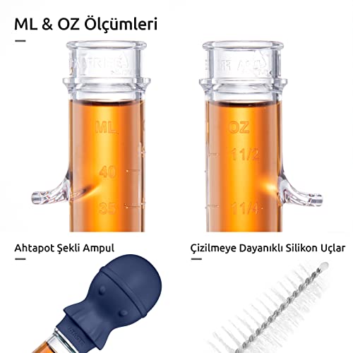 [Silicone resistente al calore e Tritan] La siringa per tacchino U-Taste è costruita per pipettare succo caldo. Nessun problema di fusione. Il bulbo di polpo è realizzato in silicone resistente al calore a 315 ℃ e il corpo è realizzato in tritan alimentare privo di BPA (Tritan è un PCTG con una resistenza alla temperatura da -20 a 109 °C). La texture trasparente simile al cristallo ti consente di eliminare ciò con cui stai imbevendo il cibo. Può essere usato per ungere tacchino o prosciutto, estrarre il grasso dalla cottura del polpettone, rimuovere il grasso dalla carne di hamburger.