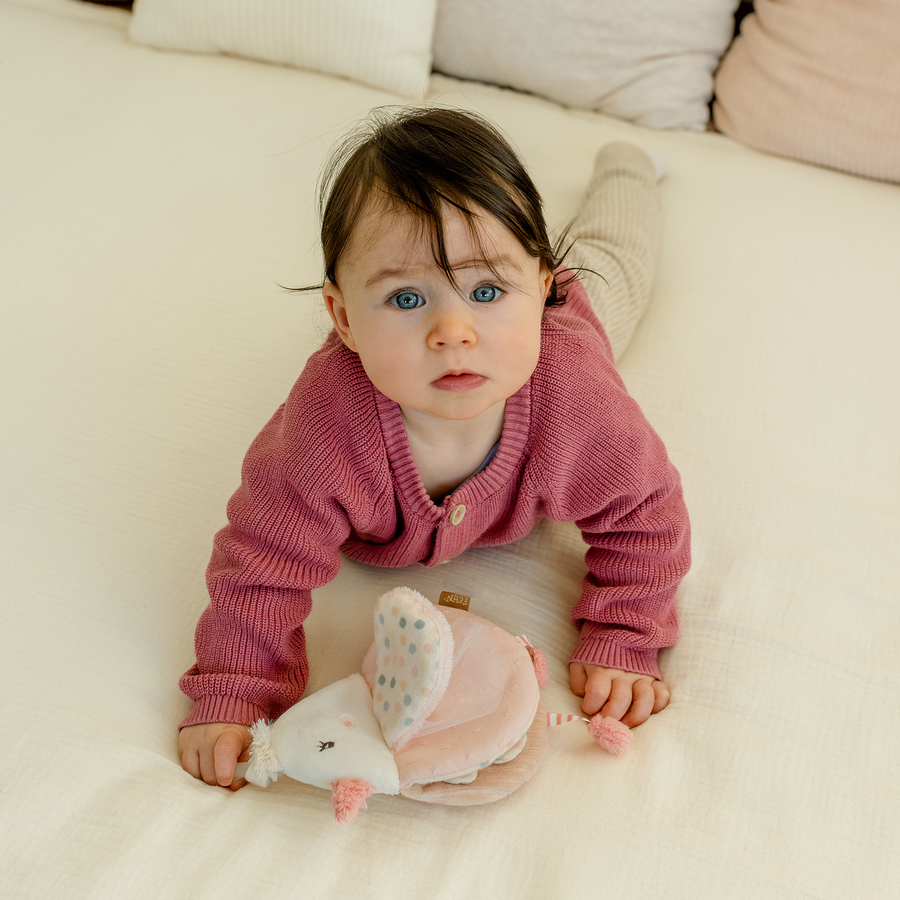 Dettagli del prodotto: Età: da 0 mesi Libro dei sentimenti in forma di uccello: 4 pagine dai colori delicati e con funzioni emozionanti da sentire, afferrare e meravigliare Il topolino con sonaglio e la farfalla di carta frusciante si coccolano sotto le sue ali Il piccolo specchio fa sorridere il vostro bambino Promuove i primi esercizi di presa, il senso del tatto e contribuisce allo sviluppo positivo dell'autoconsapevolezza Il ricamo Glow-in-the-dark si illumina al buio Anello di fissaggio sul libro illustrato per un fissaggio facile e sicuro al seggiolino auto, alla carrozzina, al lettino o all'auto. Divertentissimo, sia a casa che in viaggio Dimensioni e peso: Dimensioni da montato (altezza): 22 cm Materiale e cura: Materiale della tomaia: Nicki, velour, mussola, velluto a coste, peluche, boucle, tulle Imbottitura: poliestere Istruzioni per la cura: Lavabile a 30°C La consegna include: 1 x uccello libro in tessuto fehn