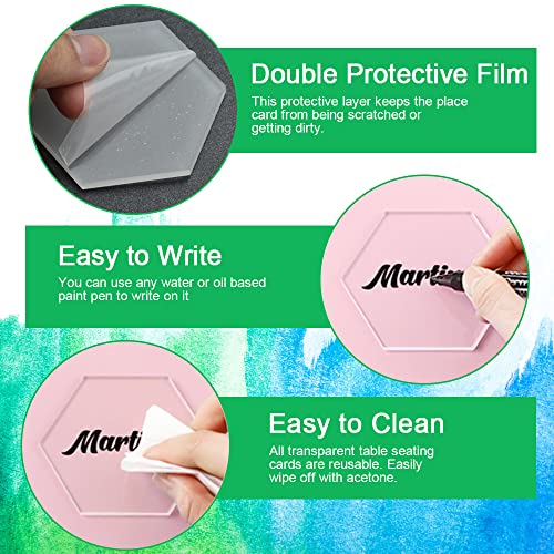 【Design esagonale, pratici accessori da sposa】 Le nostre carte acriliche esagonali o le carte di riserva sono perfette per l'arredamento di nozze moderno! Perfettamente dimensionato per stare su un piatto, un tovagliolo, un tavolo o un contenitore, aggiungendo un tocco di lusso alla tua tavola di nozze. Queste esclusive carte esagonali in acrilico trasparente saranno un pratico accessorio per il tuo matrimonio.