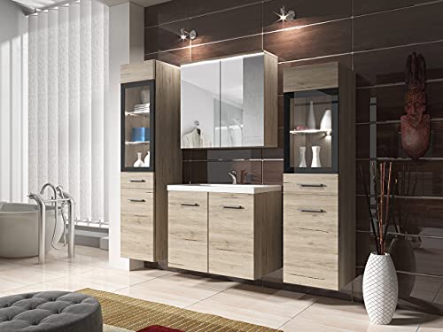 Udine II - Set di mobili da bagno con lavabo e sifone, bagno moderno, completo, con specchio, mobiletto per lavabo, armadietto alto, con illuminazione LED bianca, San Remo