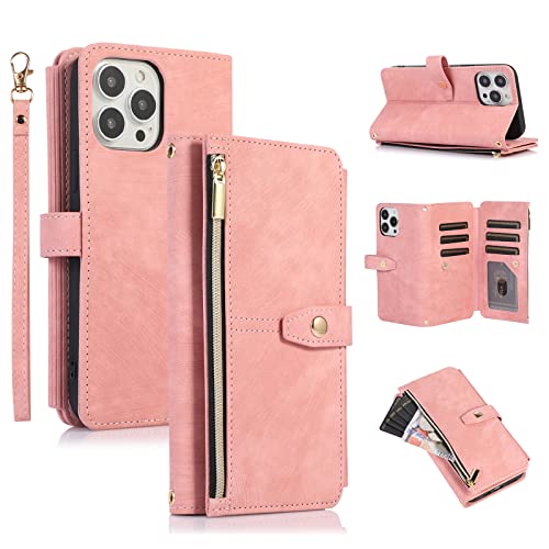 UEEBAI Custodia per iPhone 13 PRO Max 6,7 Pollici, 9 Slot per schede Retro Leather Wallet Flip Cover con Tracolla Slot per Carte con Cerniera Tasca Cavalletto Borsa Chiusura Magnetica -Oro Rosa