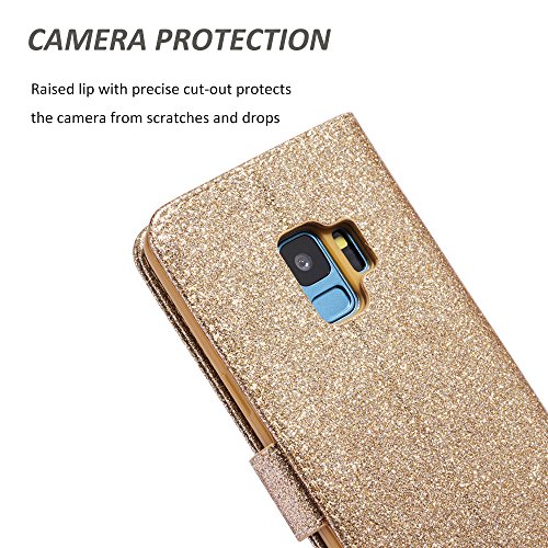 UEEBAI Case for Samsung Galaxy A5 2017, Premium Bling Glitter Glossy PU Leather Wallet Case Flip Cover with [Diamond Buckle] [Card Slots] [Magnetic Clasp] Stand Function Rhinestone Handbag Style Inner Flexible TPU Case with Wrist Strap for Samsung Galaxy A5 2017 - Gold