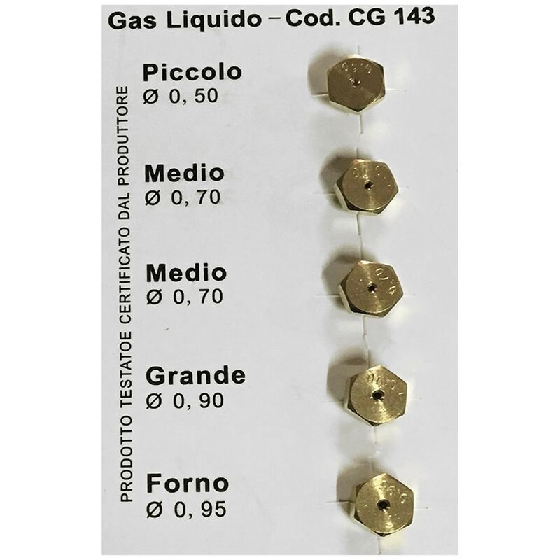 In kit da 5 pezzi. composizione: 1 pezzo piccolo +â-£ 0,50, 2 pezzi medio +â-£ 0,70, 1 pezzo grande +â-£ 0,90, 1 pezzo forno +â-£ 0,95. in blister.per gpl