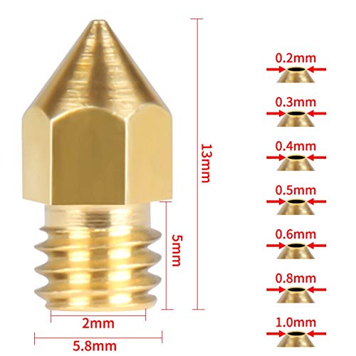 Parametro ugelli per stampante 3D MK8: diametro di ingresso: 1.75 mm. Diametro di uscita: 0.2mm, 0.3mm, 0.4mm, 0.5mm, 0.6mm, 0.8mm, 1.0mm. Filettatura: M6.