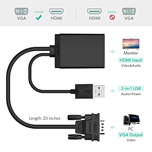 Ugreen 40213 VGA a HDMI, Convertire video VGA e audio analogico USB in segnale digitale HDMI 1080P, Nero
