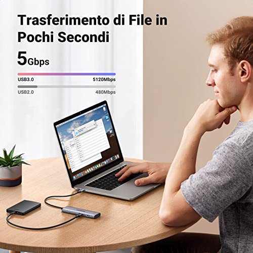 [ Alta Velocità 5 Gbps ] Dotato di 4 porte USB 3.0, questo hub USB Type C offre una velocità di trasferimento dati fino a 5 Gbps, 10 volte superiore a quella dell'hub USB 2.0, consentendo di trasferire film ad alta definizione o file di grandi dimensioni in pochi secondi. Compatibile con USB 3.0, USB 2.0 e USB 1.1.