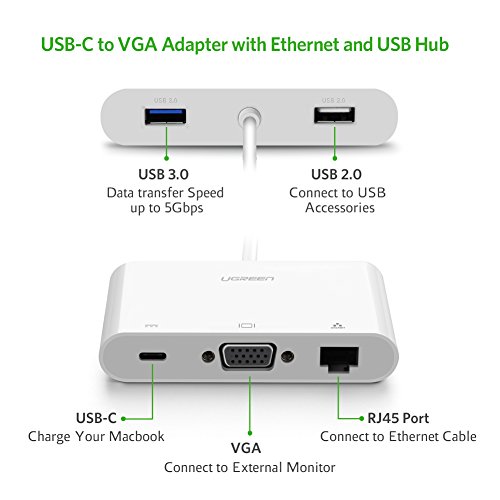 UGREEN Adattatore Tipo C a VGA Convertitore Tipo C a VGA(1080P) + RJ45 10/100Mbps Ethernet+ Hub USB per MacBook 2015/2016, Google Chromebook Pixel e HDTV, Huawei Matebook, Samsung Galaxy S8, S8+, etc.