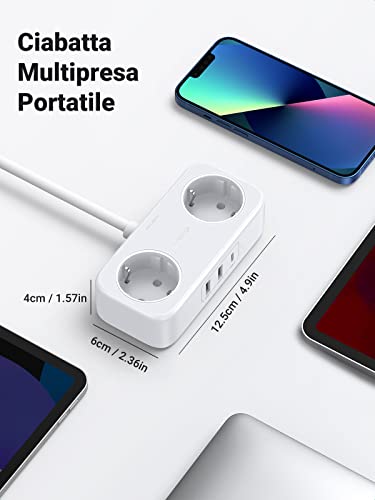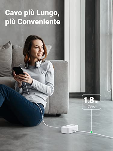 [2 Prese AC & 3 Porte USB] Questa presa multipla ha 2 prese e 3 porte USB (1 porta USB C e 2 porte USB A), la lunghezza del cavo è di 1,8 m. Le porte USB possono caricare più velocemente telefoni, tablet e altri dispositivi. Soddisfa i tuoi requisiti di alimentazione e ricarica per più dispositivi. Uno per Tutti.