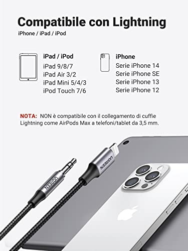 [ Ampia Compatibilità ] Questo cavo jack audio per iPhone funziona bene con tutti i dispositivi iOS con un connettore Lightning (iOS 10.3.1 o successivo). Compatibile con iPhone 14 Pro Max/ 14 Pro/ 14 /13 Pro Max/ 13 Pro/ 13/ 13 Mini/ 12/ SE 2020/ 11/ XS/ XR/ X/ X/ 8/ 7/ 6, iPad Mini/ Air/ Pro, iPod Touch 6°/ 7°. Nota: Non è compatibile con iPad Pro 2018 11" / 12,9" che ha un'interfaccia USB C.