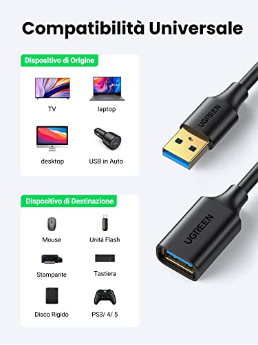 [ Ampia Compatibilità ] UGREEN Cavo prolunga USB 3.0 consente di estendere la connessione tra le periferiche USB dotate di USB A, come chiavetta USB, tastiera, mouse, fotocamere digitali, hard disk, controller PS4/Xbox, lettore schede, stampante, telefoni VolP, webcom, videocamera, microfono, lettori CD, ecc.