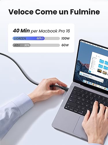[ Ricarica Rapida PD 100W ] UGREEN Cavo USB C a USB C 100W supporta la ricarica rapida di PD 3.0 con una potenza massima da 100W (5A/20V). Si può caricare completamente MacBook Pro 16" in soli 90 minuti e ci vogliono solo 30 minuti per caricare iPhone 15 al 60%.