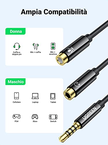 UGREEN Cavo Sdoppiatore Microfono Cuffie Adattatore Splitter Jack 3,5mm, Cavo Audio Microfono e Cuffie Maschio a Femmina Y Jack per PC, PS4, Xbox One, Smartphone, Tablet, MP3, Auricolare