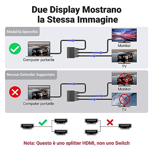 UGREEN Splitter HDMI 1 Ingresso 2 Uscite 4K@60Hz per Doppio Monitor Compatibile con HDCP 2.2 3D HDR EDID Adattatore HDMI, PS4 5, Monitor, Proiettore