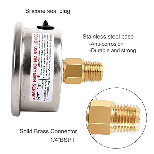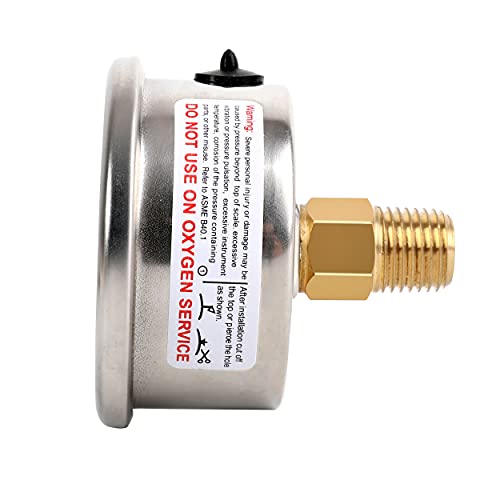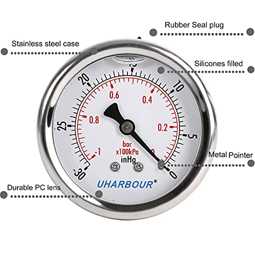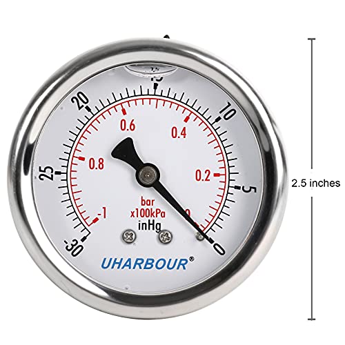 UHARBOUR Manometro di vuoto riempito di glicerina, 2-1/2 "quadrante trasparente, 1/4"BSPT connessione posteriore, cassa in acciaio inossidabile, movimento in ottone, doppia bilancia -30inHg/-1BAR-0..