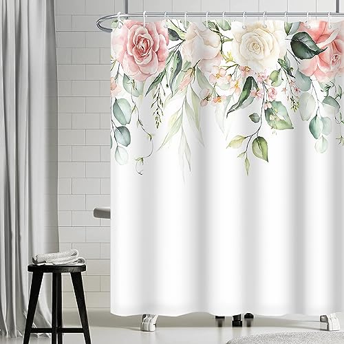 Uiiooazy Tenda Doccia Eucalipto, Tenda da Doccia Foglie Verde Salvia Fiori Rosa Bianca Tenda per Doccia Antimuffa Impermeabile Tessuto Poliestere Lavable Tenda Vasca da Bagno con 12 Ganci 220Lx180Acm