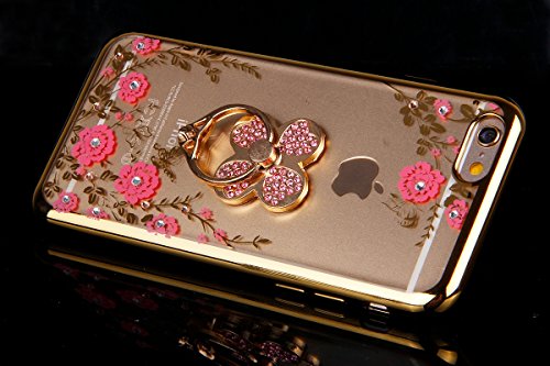Ukayfe Custodia Resistenti per iPhone 6/6S 4.7, Confine di placcatura Disegni Bella Vintage Elegante Trasparente Clear View Ultra Slim Sottile Morbida Soft TPU Silicone Gomma Gel Intarsiato Vans Glitter Brillantini Bling Diamante e Colorate Fiore Dipinto, Particolari Fantasia Lusso per Donna Ragazza Antiurto Protettiva Rigida Anti-scratch Cover Case Custodia Bumper -D'oro-Fiore rosa con Trifoglio supporto